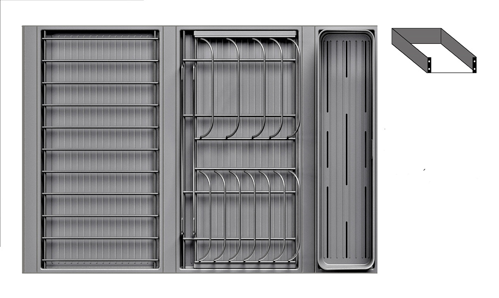 - 1 большой модуль для посуды + 1 большой модуль с решеткой + модуль для столовых приборов