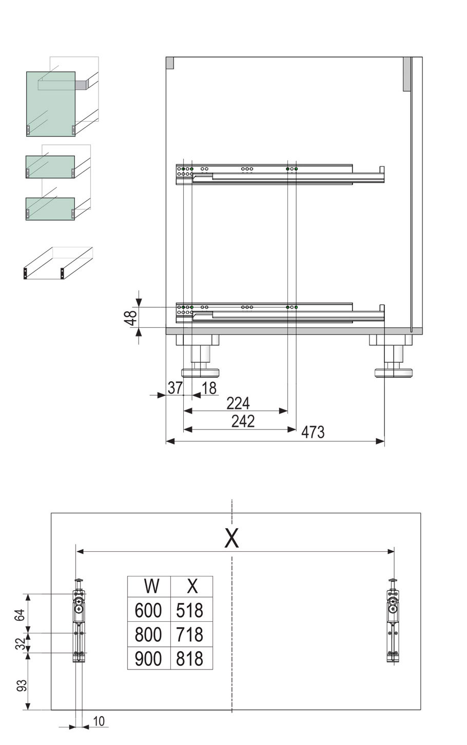 • 1 большой модуль для посуды + 1 малый модуль для посуды + 1 малый модуль с решеткой
